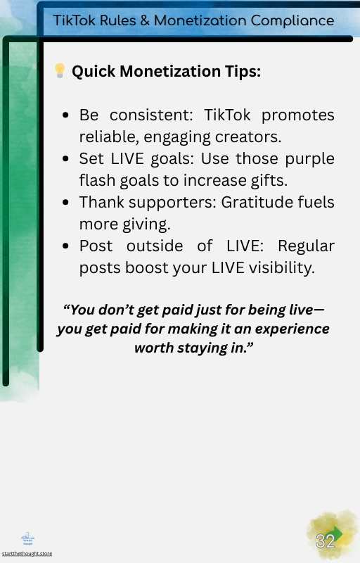 Week 3 – Monetize Your Lives: Master strategies for earning income through gifts, coins, offers, and subtle calls-to-action that feel natural.