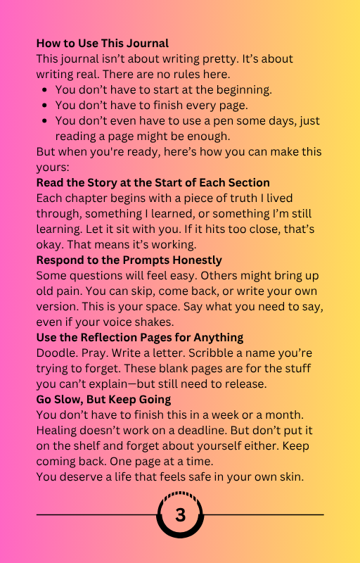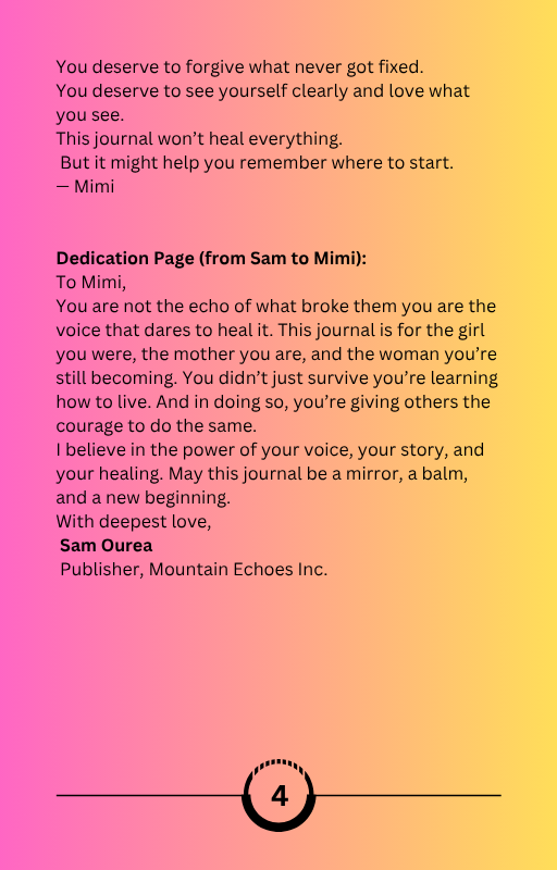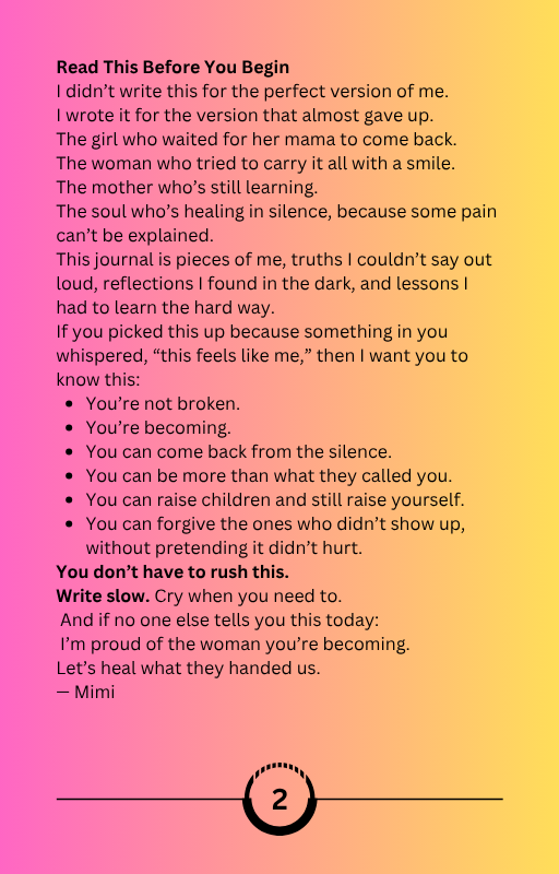 Each page feels like a conversation between the woman you were, the mother you are, and the woman you’re still becoming. Mimi’s words reach deep — they remind you that you are not broken, just becoming; that you can forgive without forgetting; and that healing doesn’t mean pretending the past didn’t happen — it means deciding that it no longer gets to define you.